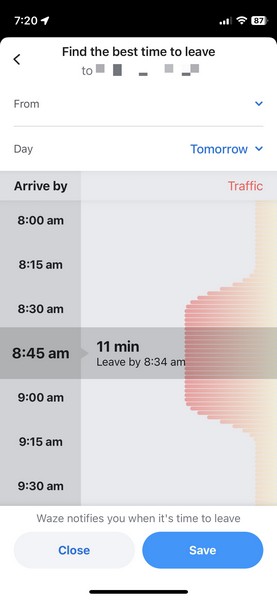 Die App wird es auch tunZeigt Ihnen die ungefähre Zeit an, die Sie benötigen, um den Standort zu erreichen, und schlägt Ihnen außerdem eine relevante Zeit zum Verlassen Ihres aktuellen Standorts vorum das Ziel zum angegebenen Zeitpunkt zu erreichen. Waze sendet Ihnen außerdem vor Ihrem geplanten Fahrer eine Benachrichtigung, um Sie daran zu erinnern.
