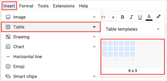 Sie können eine Tabelle hinzufügenGoogle Docsindem Sie einfach die Anzahl der gewünschten Zeilen und Spalten auswählen.