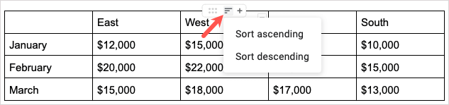 Sie können auch mit der rechten Maustaste auf die Spalte klicken und zu navigierenTabelle sortieren, und auswählenAufsteigend sortierenoderAbsteigend sortierenim Pop-out-Menü.