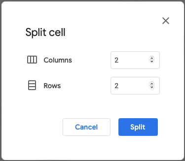 - Geben Sie im Popup-Fenster die Anzahl der Spalten oder Zeilen ein, in die Sie die Zelle aufteilen möchten. Sie können die Pfeile auch verwenden, um in kleinen Schritten nach oben und unten zu navigieren.