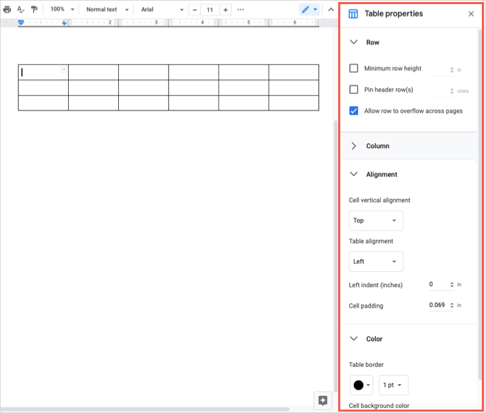 Möglicherweise möchten Sie vor oder nach dem Hinzufügen von Daten einige Änderungen am Erscheinungsbild Ihrer Tabelle vornehmen. Sie können Zeilen-, Spalten-, Ausrichtungs- und Farbeigenschaften für eine Google Docs-Tabelle anpassen.