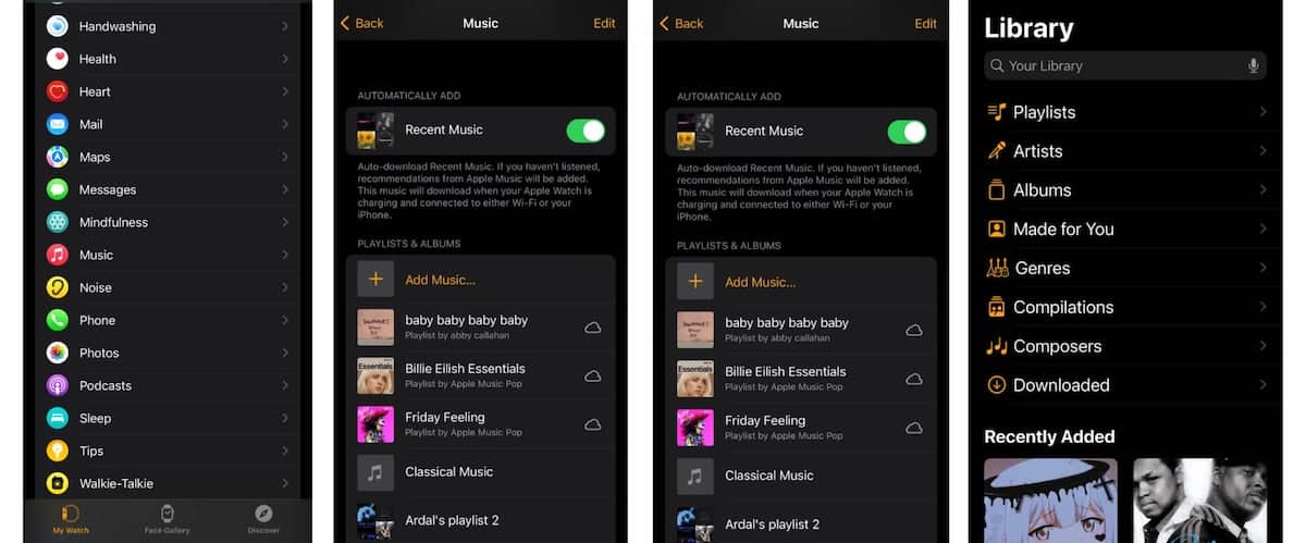 Benutzer können über die Apple Watch-App auf dem iPhone Wiedergabelisten, Alben und Podcasts zu ihrer Smartwatch hinzufügen.