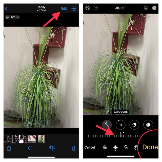 Glücklicherweise können Sie sowohl mit der Kamera-App als auch mit der Fotos-App die Belichtung anpassen. So können Sie nicht nur beim Fotografieren, sondern auch während der Bearbeitung eine Feinabstimmung vornehmen. Selbst wenn Sie den Trick beim Aufnehmen von Bildern übersehen, können Sie ihn später beheben.