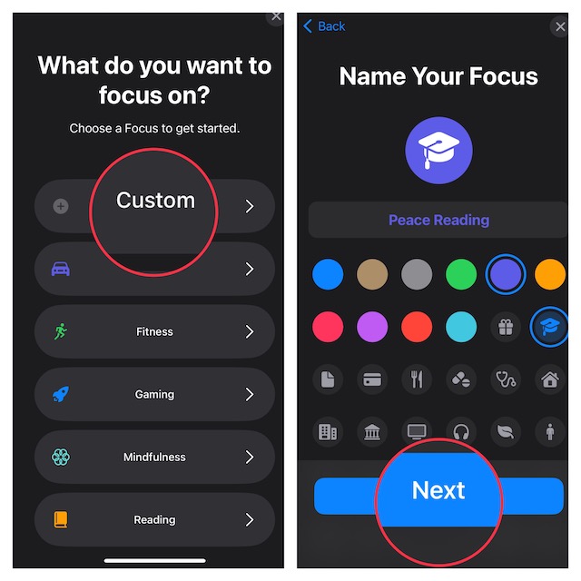 5.Geben Sie als Nächstes Ihrem Focus einen passenden Namen und wählen Sie ein Symbol aus. Tippen Sie dann aufWeiter -> Passen Sie den Namen des „Fokusprofils“ an.