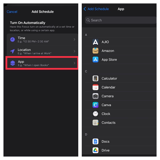 11.Wählen Sie im Bildschirm „Zeitplan hinzufügen“ die Option aus„App“.