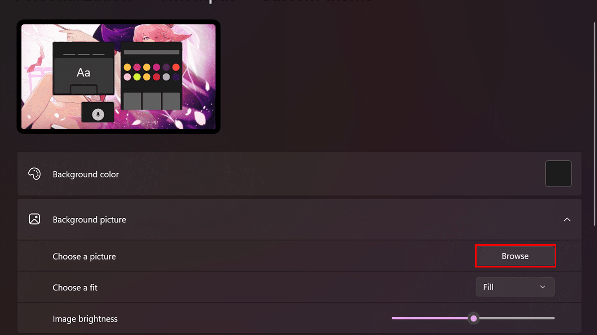 - Klicken Sie aufHintergrund BildEinstellung und in der „Wählen Sie ein BildKlicken Sie auf die Einstellung „DurchsuchenKlicken Sie auf die Schaltfläche, um ein Bild auszuwählen.