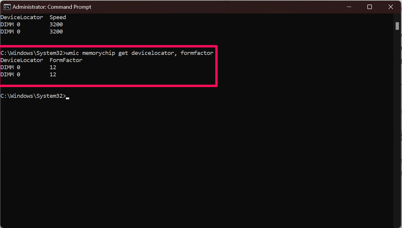 wmic memorychip get devicelocator, formfactor3.Du wirsteine bestimmte Zahl sehen, der den Formfaktor des RAM Ihres Geräts darstellt, wird im Eingabeaufforderungsfenster angezeigt.