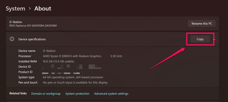5.Sie können auch auf klickenSchaltfläche „Kopieren“.in der oberen rechten Ecke des Abschnitts „Gerätespezifikationen“, um alle Informationen in die Zwischenablage in Windows 11 zu kopieren.