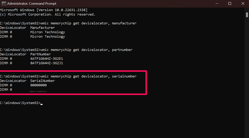 wmic memorychip get devicelocator, serialnumber3.Sobald Sie drückenEingeben, wird die Seriennummer des installierten RAM Ihres Windows 11-PCs oder -Laptops im Eingabeaufforderungsfenster angezeigt.