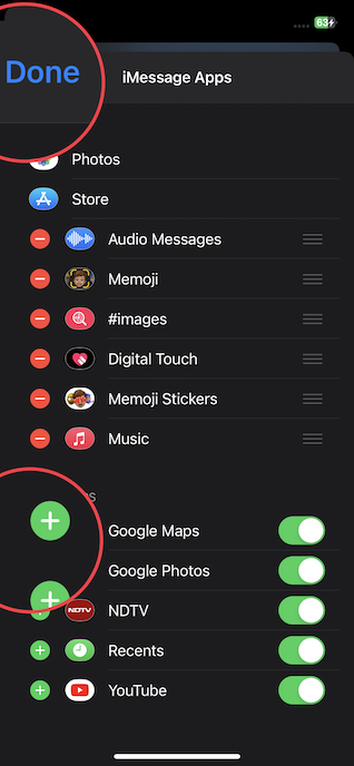 - Nachdem Sie die App-Schublade in der Apple Messages-App auf Ihrem iOS- oder iPadOS-Gerät angepasst haben, tippen Sie unbedingt aufErledigtin der oberen linken Ecke des Bildschirms, um den Vorgang abzuschließen.
