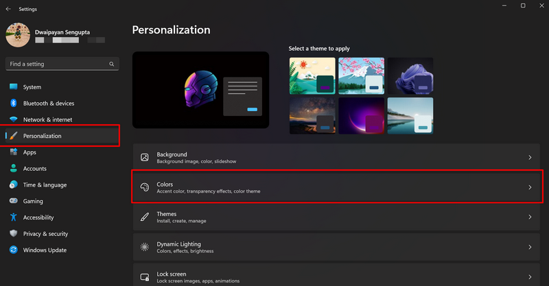 Wenn diese Einstellung auf Ihrem Windows 11-PC oder -Laptop aktiviert ist, haben die Taskleiste und das Startmenü dieselbe Farbe wie die Designfarbe Ihres Geräts. Sie können die Designfarbe Ihres Systems einfach über den Abschnitt „Akzentfarbe“ im Menü „Farben“ ändern, um die Farbe der Taskleiste zu ändern.