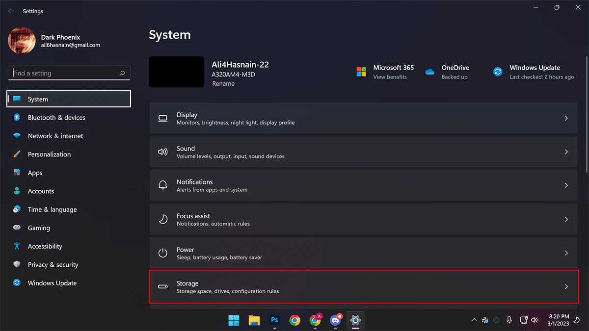 - OffenEinstellungen> Klicken Sie aufSystem> Klicken Sie aufLagerung.