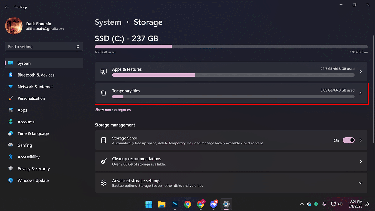 - Unter demApps & FunktionenOption, klicken Sie auf dieTemporäre DateienOption.