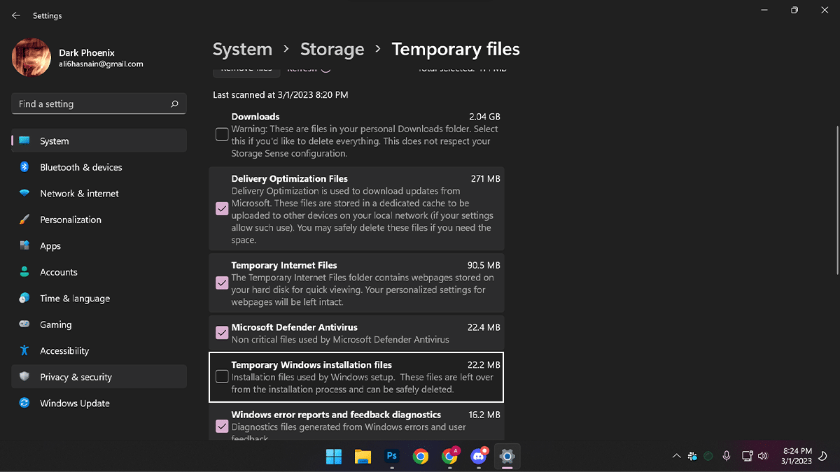 - Wählen Sie die ausVorherige Version von WindowsoderTemporäre Windows -InstallationsdateienKontrollkästchen.