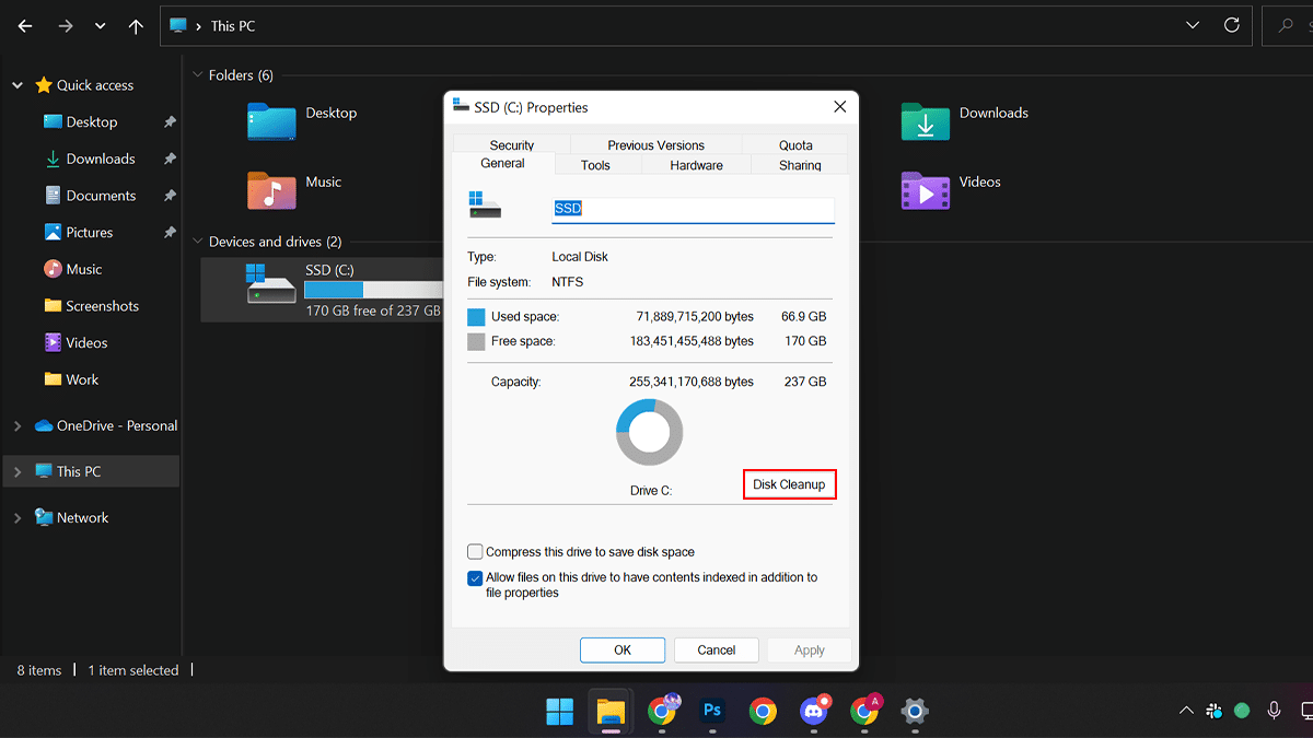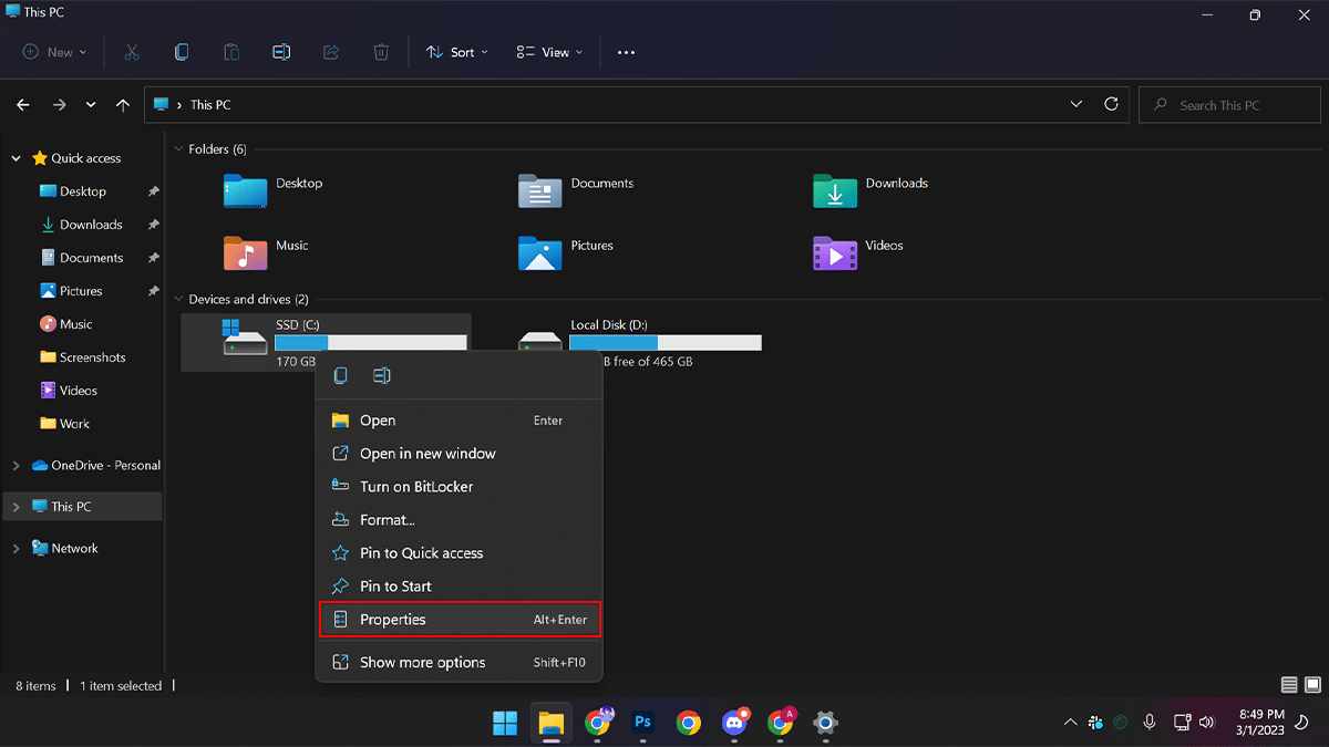 - OffenDatei Explorer> Klicken Sie aufDieser PC> unter demGeräte und Laufwerke> Klicken Sie mit der Windows 11-Installation mit der rechten Maustaste auf das Laufwerk (normalerweise auf dieC Laufwerk)> Klicken Sie auf dieEigenschaftenOption.