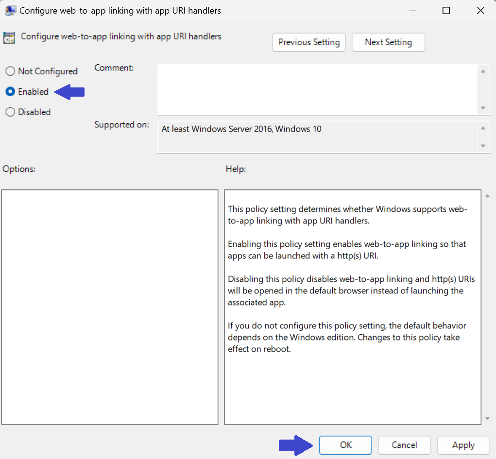 4. Es erscheint ein Eingabeaufforderungsfeld. Wählen Sie zum Aktivieren die Option Aktiviert aus. Klicken Sie auf OK und Übernehmen.