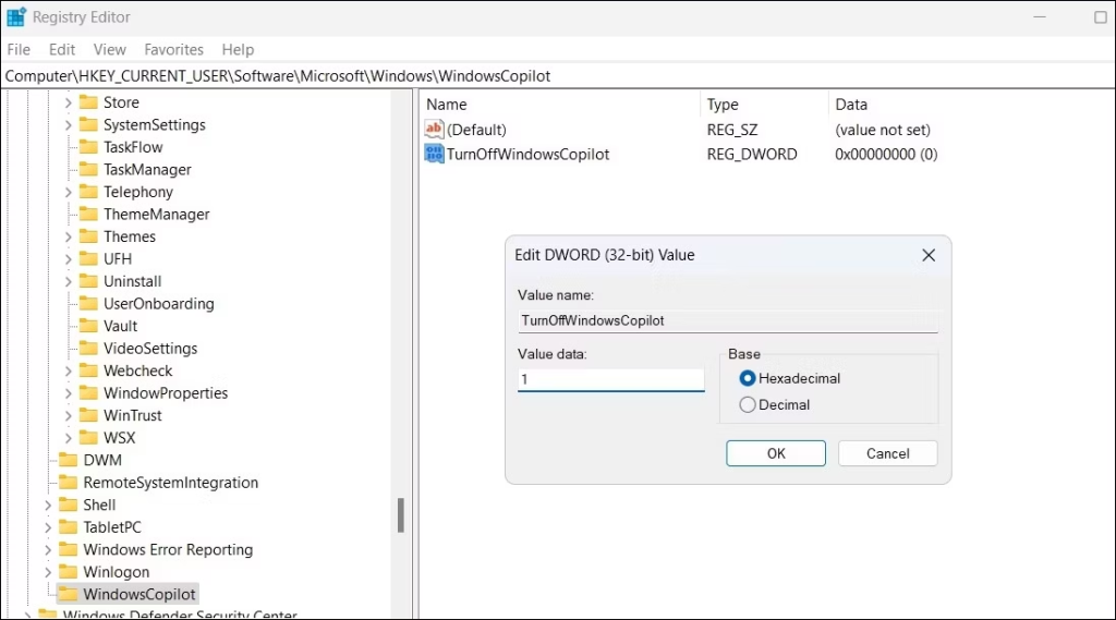 Schritt 7: Doppelklicken Sie auf das DWORD „TurnOffWindowsCopilot“, geben Sie „1“ in das Textfeld ein und klicken Sie auf „OK“.