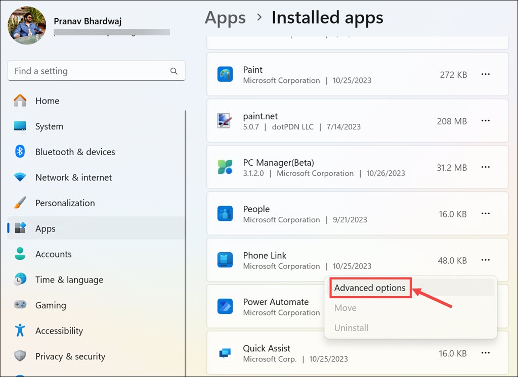 4.Klicken Sie auf das Symbol mit den drei Punkten und wählen Sie ausDeinstallierenaus den verfügbaren Optionen. Diese Option ist nur verfügbar, wenn Sie auf Windows 22H3 oder höher aktualisiert haben.