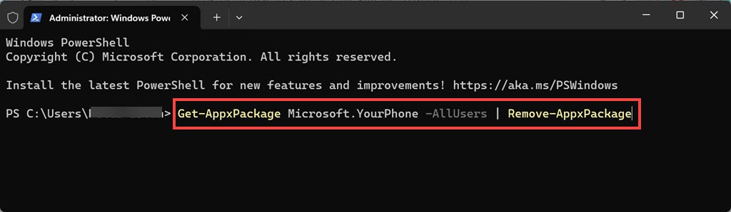2.Geben Sie im PowerShell-Fenster den folgenden Befehl ein, um die Phone Link-App zu deinstallieren:Get-AppxPackage Microsoft.YourPhone -AllUsers | Remove-AppxPackage