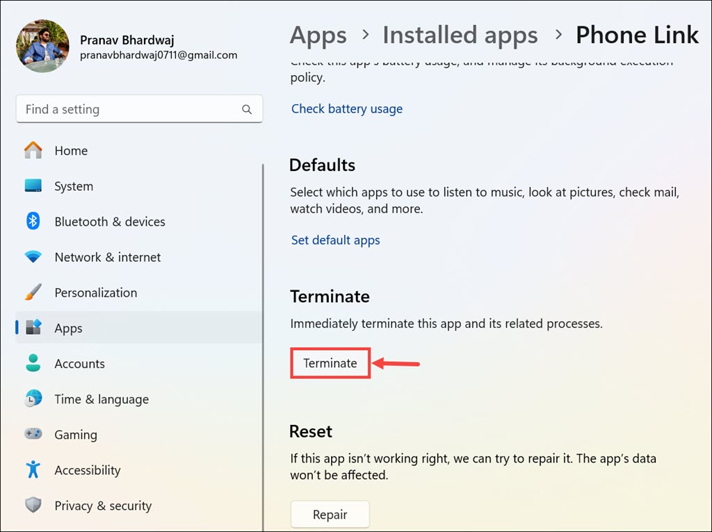 6.Scrollen Sie als Nächstes nach unten und klicken Sie aufBeendenKlicken Sie auf die Schaltfläche, um alle Instanzen der Phone Link-App sofort zu schließen.