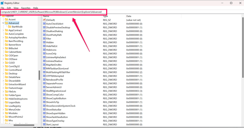 ComputerHKEY_CURRENT_USERSoftwareMicrosoftWindowsCurrentVersionExplorerAdvanced