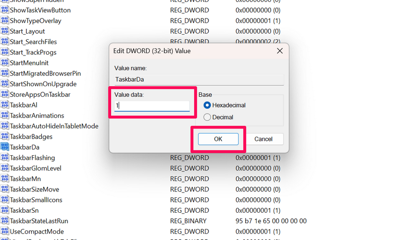 Wenn Sie die Widgets-Schaltfläche auf Ihrem Windows 11-PC oder Laptop wieder aktivieren möchten, können Sie mit den oben genannten Schritten das Eigenschaftenfenster der Option TaskbarDa öffnen und die Wertdaten erneut von 1 auf 0 ändern.