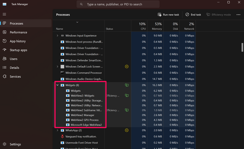 Auch nach dem Deaktivieren der Widgets-Option auf der Seite mit den Taskleisteneinstellungen werden die Widgets weiterhin in der Taskleiste ausgeführtTask-Manager, unter demHintergrundprozesseAbschnitt auf Ihrem Windows 11-PC oder Laptop.