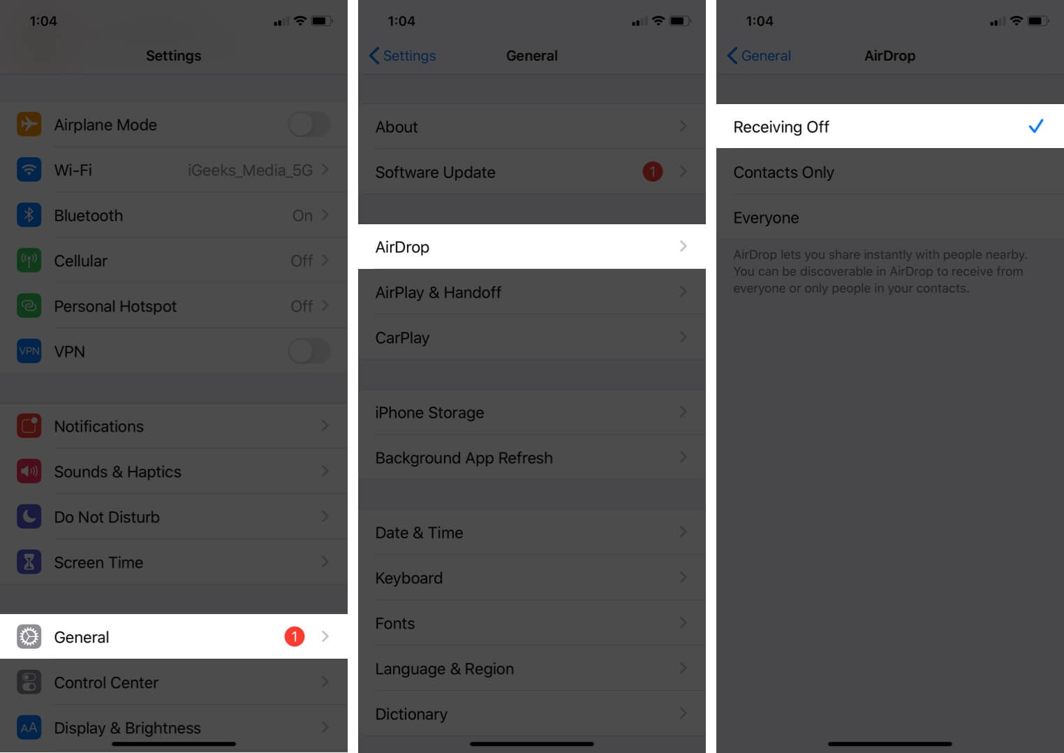 Sie können gehenEinstellungen→Allgemein→AirDrop→ auswählenEmpfang ausum zu verhindern, dass Ihr iPhone als AirDrop-Standort auf Ihrem Mac angezeigt wird. Dadurch wird jedoch verhindert, dass andere Sie ebenfalls finden.