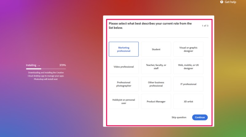 9.Während der Installation können SieBeantworten Sie ein paar einfache Fragendarüber, wie Sie Photoshop auf Ihrem Windows 11-PC oder Laptop verwenden möchten. Dies hilft Adobe dabei, die Photoshop-App nach der Installation nach Ihren Wünschen einzurichten.
