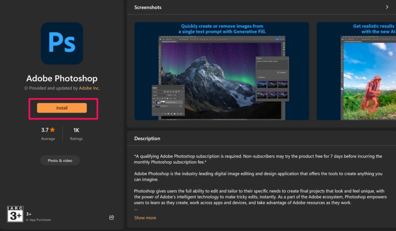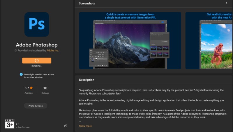 Eine weitere Möglichkeit, die Adobe Photoshop-App herunterzuladen und auf Ihrem Windows 11-PC oder Laptop zu installieren, ist der Microsoft Store. Es ist jedoch zu beachten, dass beim Herunterladen der App aus dem Microsoft Store nicht die Photoshop-App selbst, sondern die Adobe Creative Cloud-App installiert wird.