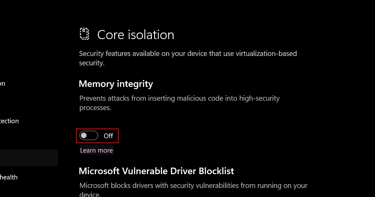 - Sicherheit Anliegen: Einige Leute sind besorgt über die Sicherheitsauswirkungen der Speicherintegrität. Sie glauben, dass damit die Ausführung legitimer Software verhindert werden könnte. Wenn Sie diesbezüglich Bedenken haben, können Sie die Speicherintegrität deaktivieren.