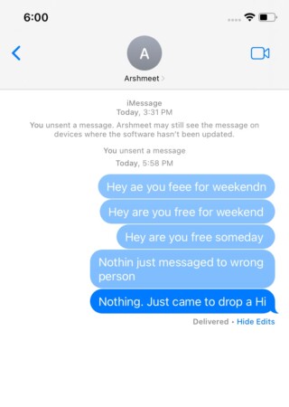 Ach ja, Sie und der Empfänger können den Bearbeitungsverlauf jeder bearbeiteten Nachricht überprüfen. Außerdem ist der Vorgang ziemlich einfach: Tippen Sie aufbearbeitet Markieren Sie unter der Nachricht, an der Sie Änderungen vorgenommen haben, das Tag, und darüber wird der Bearbeitungsverlauf angezeigt.
