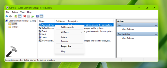 2. Gehen Sie im Snap-In „Lokale Benutzer und Gruppen“ zum Ordner „Benutzer“ und suchen Sie ihnAdministratorKonto. Klicken Sie mit der rechten Maustaste darauf und wählen Sie ausEigenschaften.