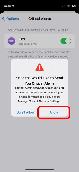 12.Tippen Sie aufErlaubenKlicken Sie in der folgenden Eingabeaufforderung auf die Schaltfläche, um die Aktivierung der Funktion „Kritische Warnungen“ für Ihre ausgewählten Medikationspläne zu bestätigen.
