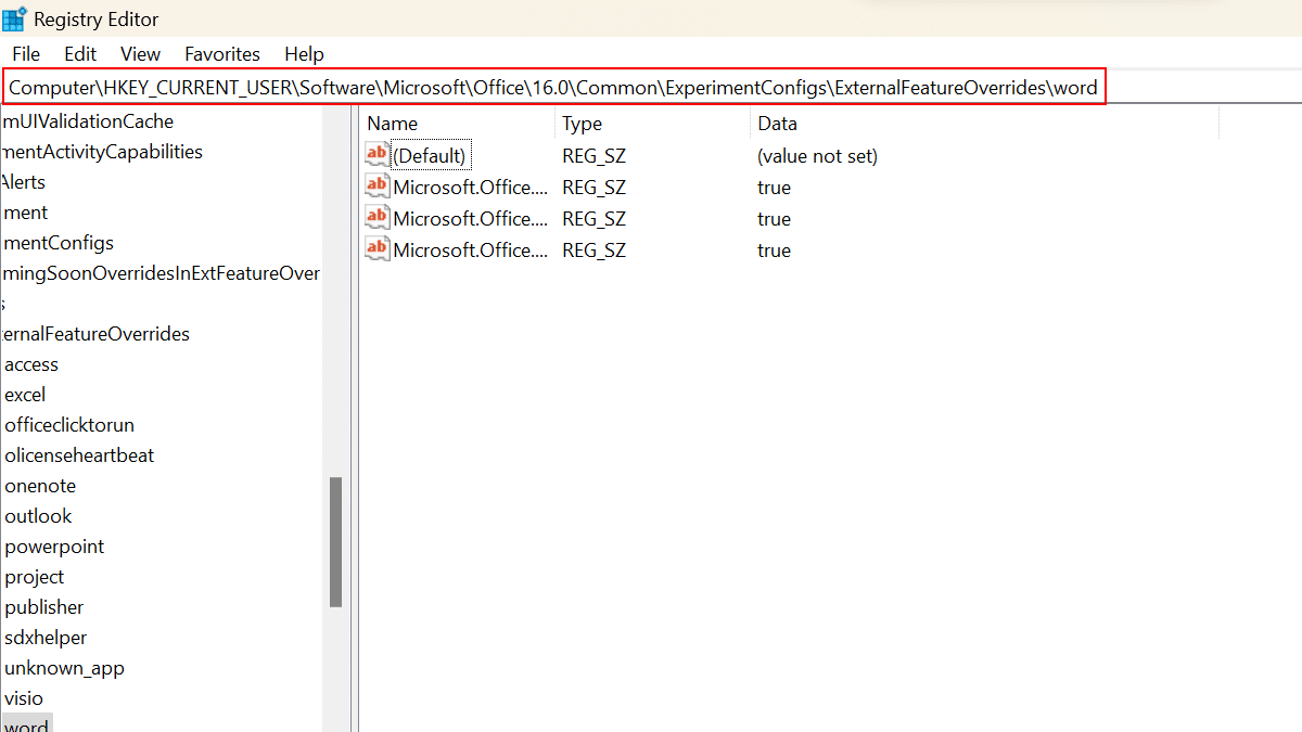 ComputerHKEY_CURRENT_USERSoftwareMicrosoftOffice16.0CommonExperimentConfigsExternalFeatureOverridesword