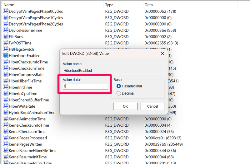 8.Wenn Sie wollenAktivieren Sie den Schnellstart auf Ihrem PC oder Laptop zu einem späteren Zeitpunkt wieder, können Sie die oben genannten Schritte ausführenÖffnen Sie die HiberbootEnabled-Eigenschaften,Ändern Sie die Wertdaten von 0 auf 1erneut und starten Sie Ihr Windows 11-Gerät neu.