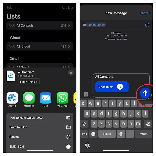 5.Schließlich erscheint das Standard-Freigabeblatt, mit dem Sie Ihre iPhone-Kontakte über das bevorzugte Medium wie WhatsApp, Nachrichten, E-Mail und mehr exportieren können. Wählen Sie die gewünschte App aus und teilen Sie die Kontakte.