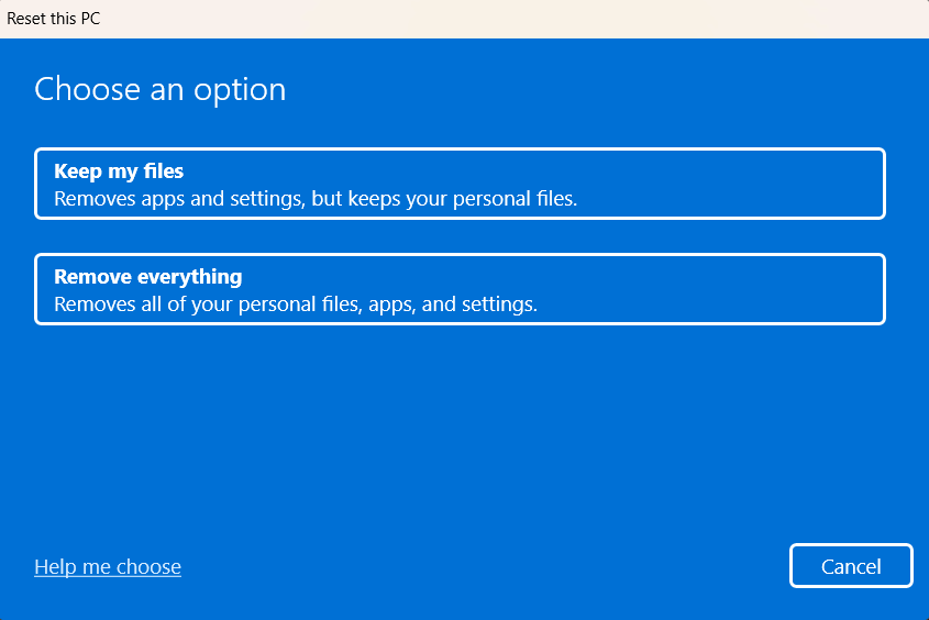Schritt 4: Wählen Sie entweder „Meine Dateien behalten“ oder „Alles entfernen“ – wählen Sie „Alles entfernen“, um einen vollständigen Werksreset durchzuführen.