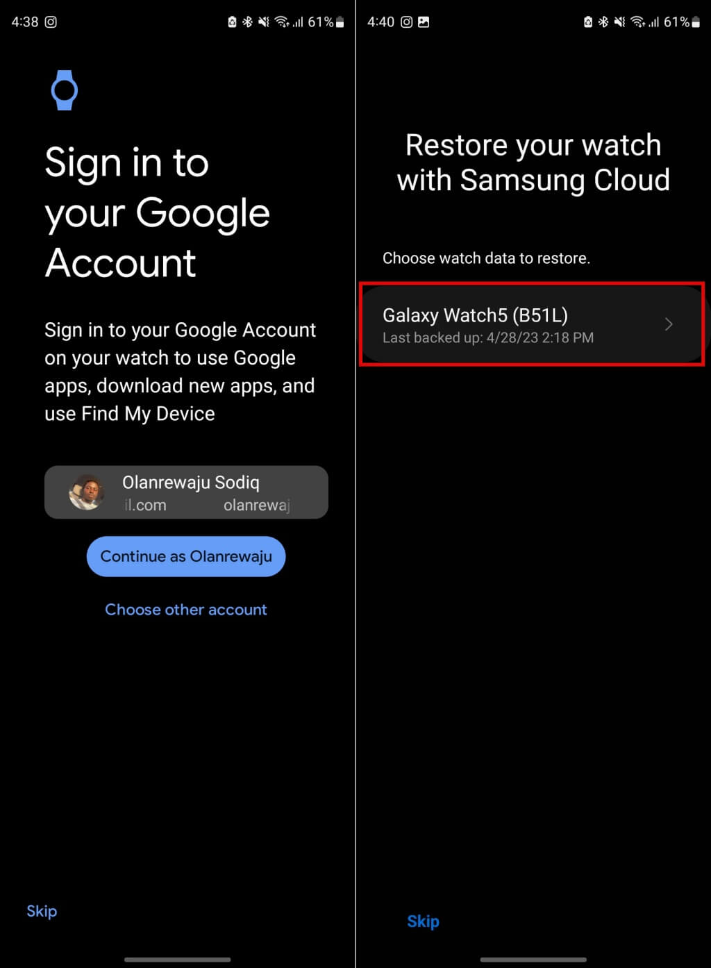 - KlopfenNächsteum mit der Einrichtung Ihrer Uhr fortzufahren, wenn die Galaxy Wearable-App Ihre Daten wiederherstellt.