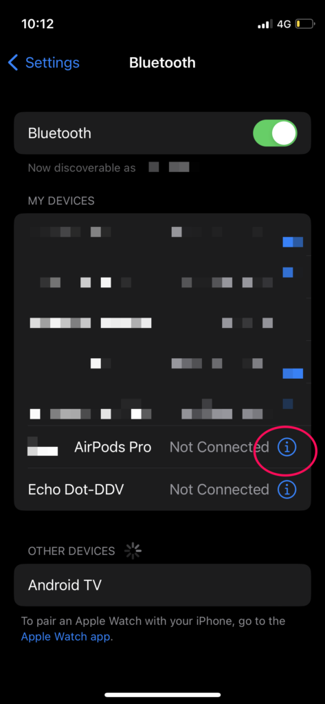 3.Finden Sie Ihre gepaarten AirPods und tippen Sie auf “ich"Knopf daneben.