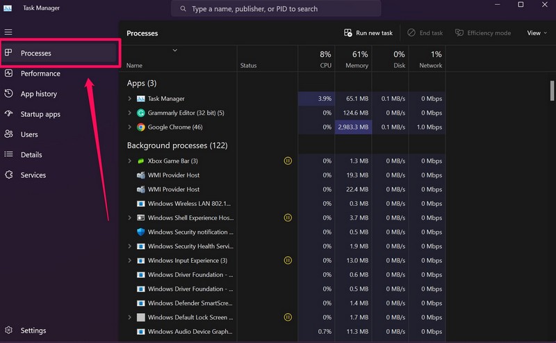 3.Gehen Sie im Task-Manager-Fenster zuRegisterkarte „Prozesse“.sofern es noch nicht geöffnet ist.