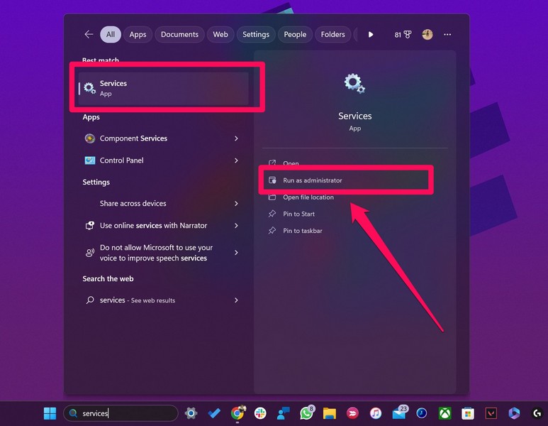 2.Klicken Sie aufAls Administrator ausführenKlicken Sie in den Suchergebnissen auf die Schaltfläche „Dienste“.