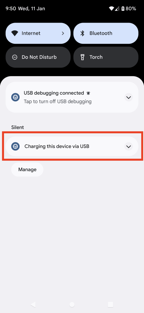 7.Öffnen Sie die Benachrichtigungsleiste und klicken Sie dort auf die Option „USB-Aufladung dieses Geräts“.