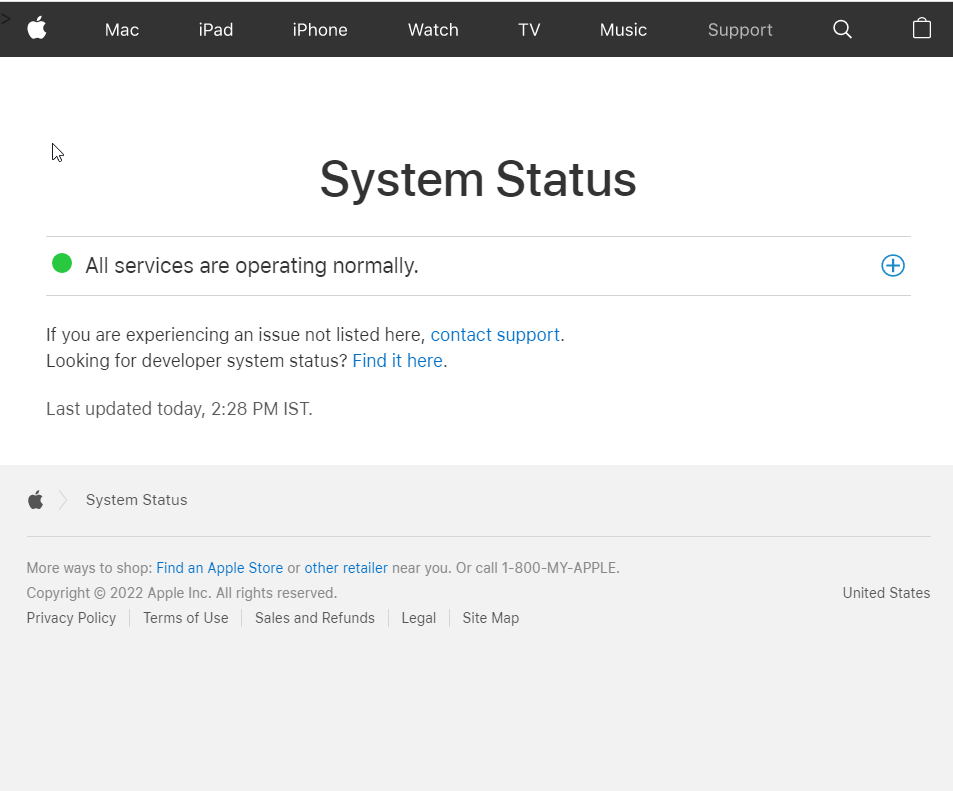 Obwohl dies kein sehr häufiges Szenario ist, gibt es doch Zeiten, in denen sogar Apps Wartungsaktivitäten im App Store und anderen Servern durchführen. Hier können Sie überprüfen, ob der Apple-Server ausgefallen ist. Besuchen Sie dazu dieSeite „Systemstatus“.um zu überprüfen, ob alle Dienste normal funktionieren und als nächstes einen grünen Punkt haben.