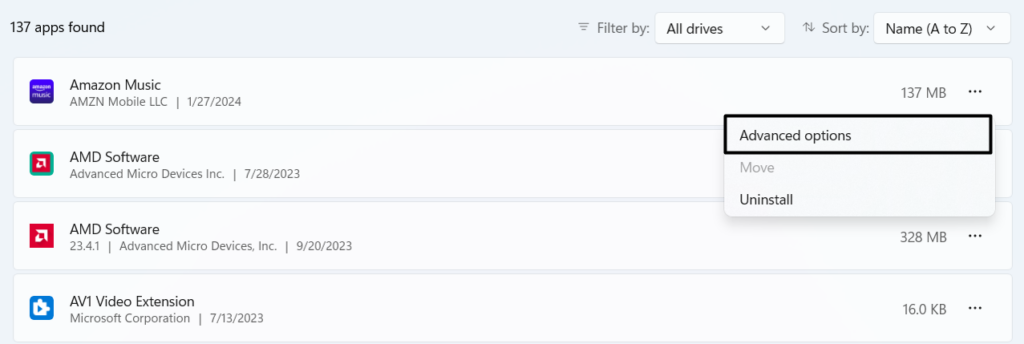 3.Suchen Sie das kranke Programm und klicken Sie aufdrei Punkte (…)daneben und wählen SieErweiterte Optionen.