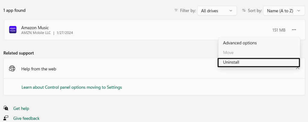 3.Sobald Sie es gefunden haben, wählen Sie das ausdrei Punkte (…)daneben und wählen Sie dann im Menü die Option ausDeinstallieren.