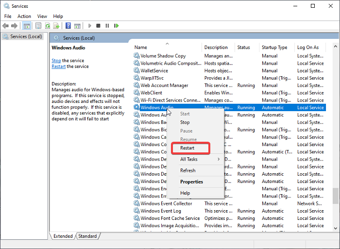 Auch die Audiodienste sollten überprüft werden, wenn Probleme mit dem Windows 10-Audiosystem auftreten. Daher müssen Sie sicherstellen, dass die Dienste ordnungsgemäß funktionieren, indem Sie sie neu starten. So geht's: