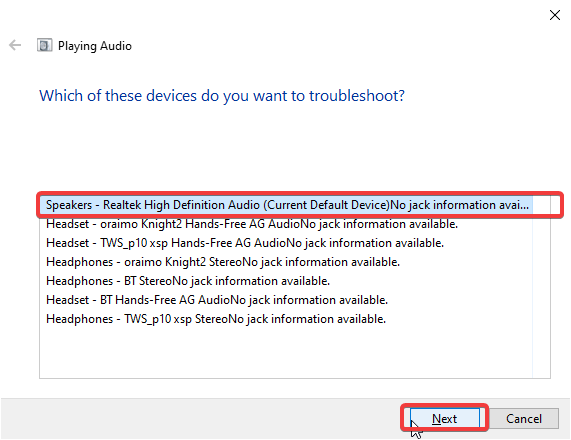 3.Warten Sie einige Sekunden auf das nächste Fenster und wählen Sie das Audiogerät aus, bei dem Sie eine Fehlerbehebung durchführen möchten. Klicken Sie anschließend aufNächsteund befolgen Sie die anderen Anweisungen, um das Problem zu beheben.