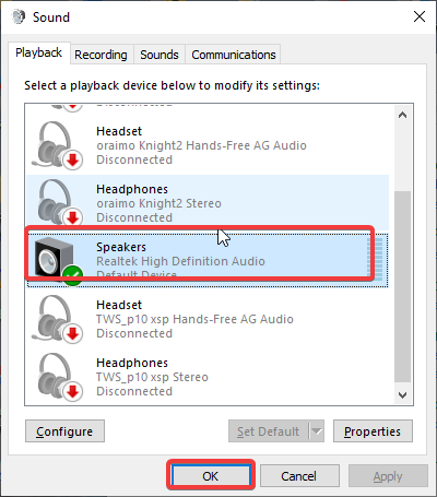 Möglicherweise verwenden Sie ein drahtloses Gerät mit Ihrem Computer und haben es vergessen. Solange das Gerät noch mit Ihrem PC verbunden ist, gibt nur das Gerät einen Ton von sich. Versuchen Sie also, das Audiogerät zu trennen und prüfen Sie, ob Ihr Audioproblem behoben ist.
