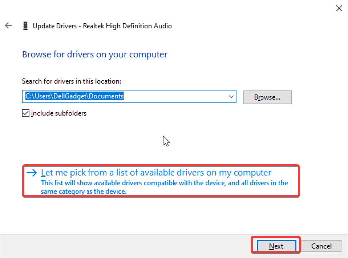 5.Wählen Sie auf der nächsten Seite ausLassen Sie mich aus einer Liste verfügbarer Treiber auf meinem Computer auswählenund schlagenNächste. Befolgen Sie dann die weiteren Anweisungen auf dem Bildschirm, um den Treiber zu aktualisieren.
